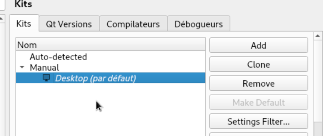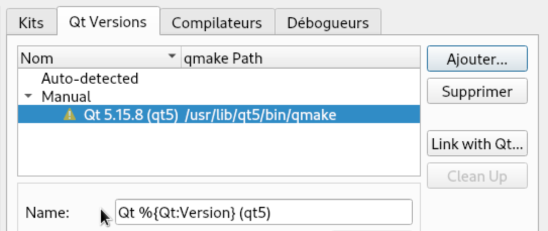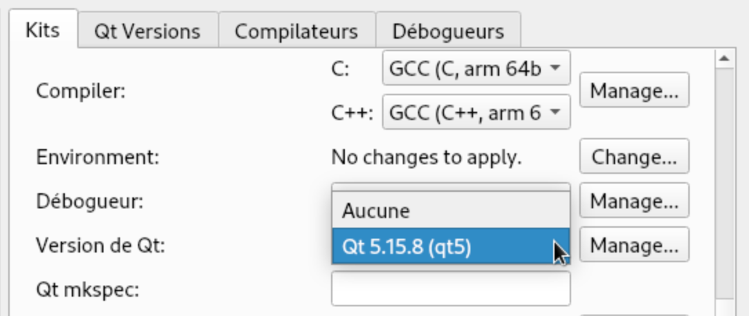 S'il n'y en a pas, choisissez Manage et ajoutez le fichier qmake qui se trouve dans /usr/bin à la racine du système de fichier :